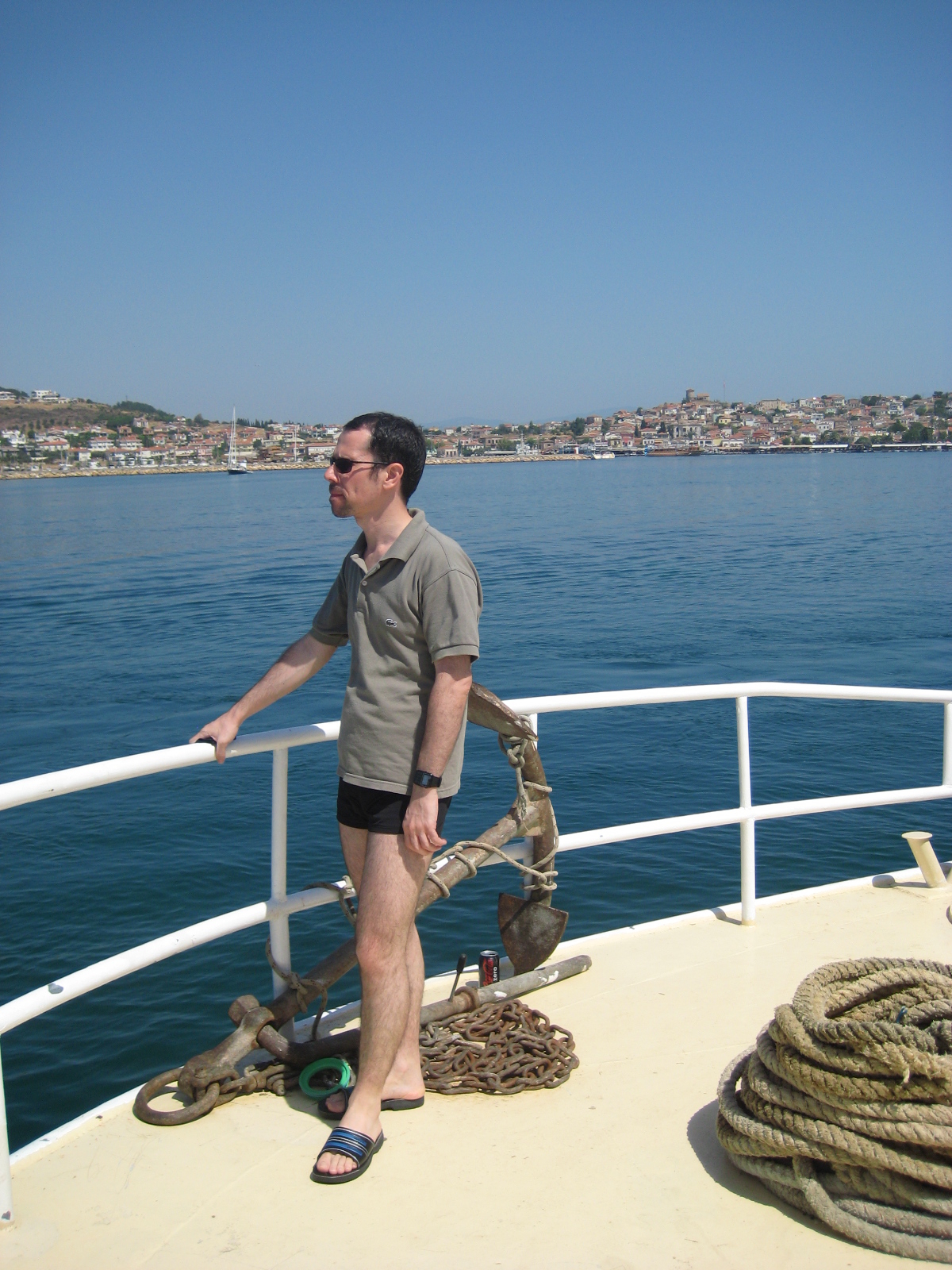 Ayvalık’ a tekrar geldik, burada tekneye binip, denize açıldık. Koylardan birinde durup, yüzme molası verdik. Ben de bu yıl ilk kez denize girme fısatı yakalamış oldum. Öğlen yemeğimizi de burada yedik. Yemekte hamsi vardı, hem de sınırsız hamsi. Ege’ deyiz ama Karadeniz’ den çıkan hamsileri yedik. Teknede çok insan vardı. Bu kadar çok insan olunca, hamsi pişirmek onlar için daha kolay oldu.