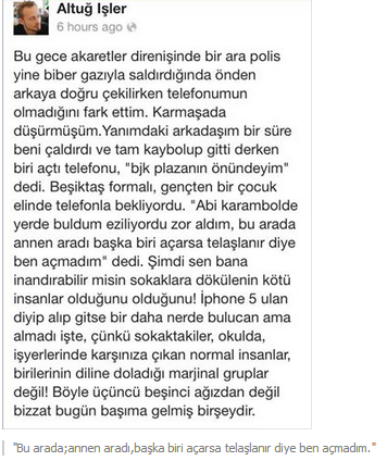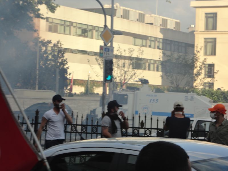 Akşam saatleri Beşiktaş’a dönerken Başbakanlık konutunun önündeki sokağın başındaki polis tomalarına bir grup tarafından taşlar atıldı. Bazı kişiler de taş atılmasın diye uğraştı ancak başarılı olamadı. Atılan pet şişelerin, taşların sayısı arttı. Polis biber gazı attı: ardından tazyikli biberli su sıktı.Suyun rengi turuncu idi. Akaretler’e doğru koşturduk. Bu sefer gözlerimiz bayağı yandı. Beş metre yanıma biber gazı kapsülü düştü. Beş dakika sonra gözlerimdeki yanma durdu. Eşimin sırtına biberli su geldi ve sırtı birkaç saat yandı.